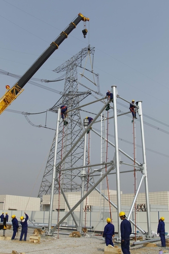 由河南送變電建設公司承建的1000千伏特高壓南陽開關站擴建工程構架吊裝施工。該公司80多名精干施工人員正加用巨力圓形吊裝帶捆綁固定,便于提升。構架工程采用全鋼管格構式鋼結構架,構架格構柱晟大總高度達85米,重達75噸,門架鋼橫梁晟大跨度達62米、晟大重量達41噸。