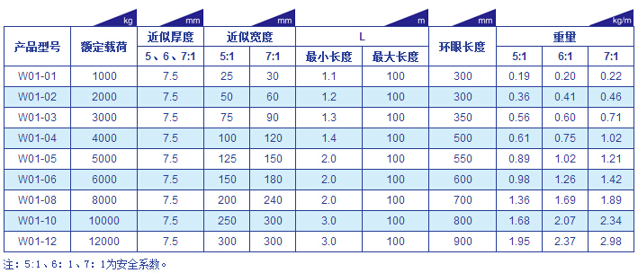 巨力W01型(環眼型)吊裝帶是起重吊裝繩索的更新換代產品,主要原材料為合成纖維,安全系數高,抗腐蝕、不導電、不易燃、不易爆、對被起吊物體有表面保護的作用,而且它具有拉伸性強的特點,有減震的作用,減少了對人身的反向傷害。