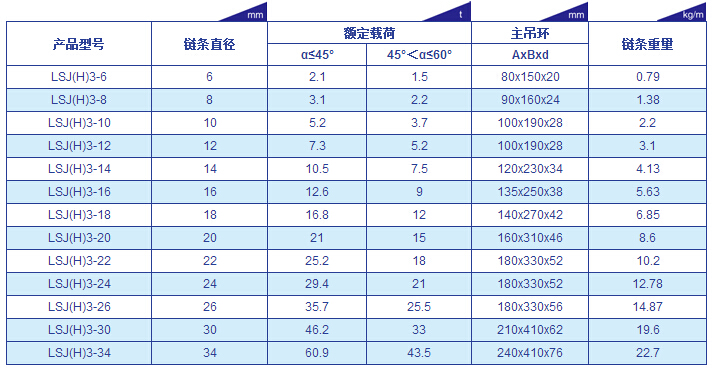 巨力S6級三肢鏈條索具參數